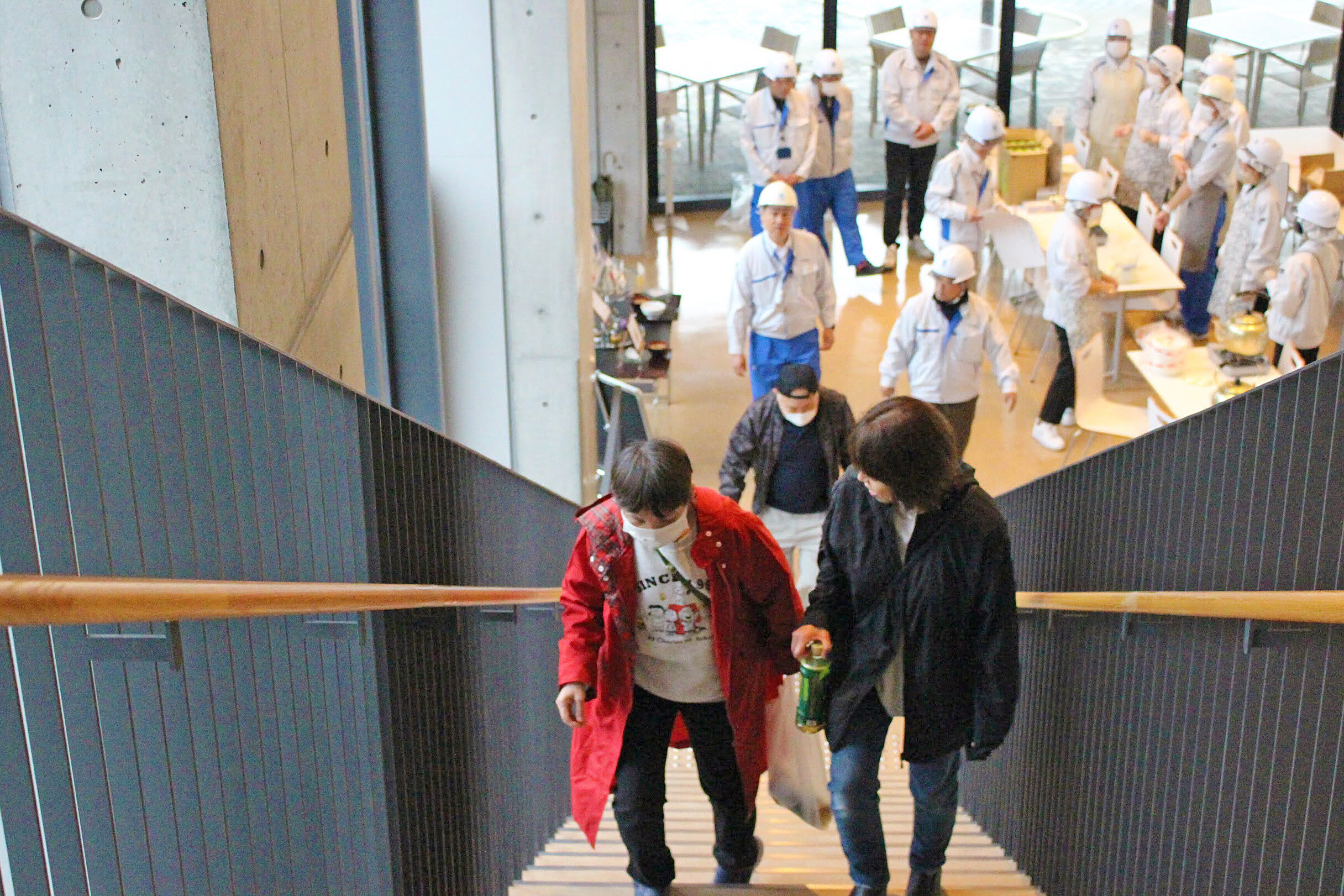 訓練は自治会館での初動対応からスタート。津波警報の受信を想定し、自治会長からフソウテクノセンターへの受け入れ要請の連絡を経て、住民の皆さまが移動を開始しました。避難場所までの道のりを各所に配置された社員が誘導し、ご高齢の方々の移動もサポート。到着後は、避難者名簿の確認や、体育館2階への誘導を行い、実際の避難、受け入れ時の行動を確認しました。