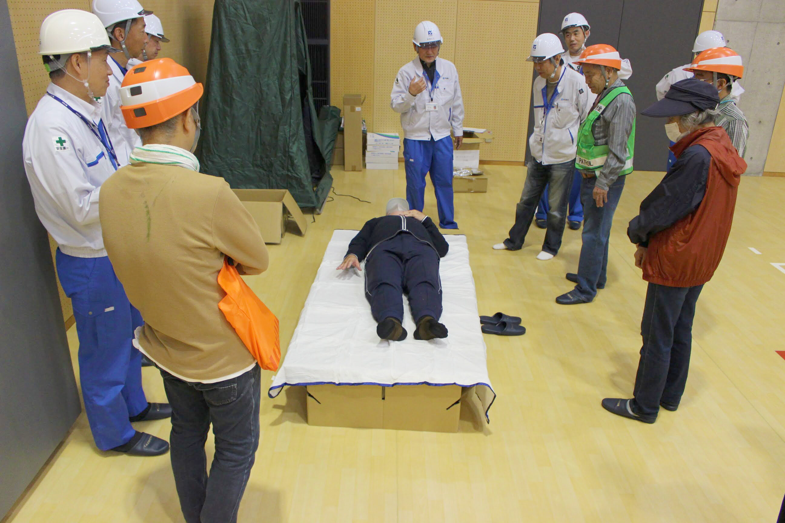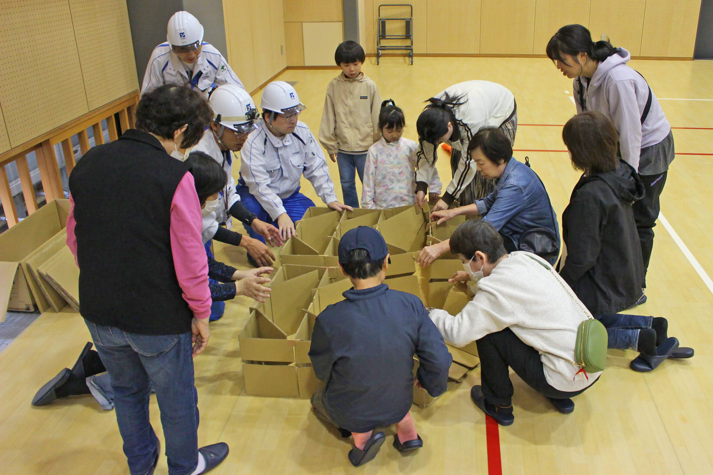 複数班に分かれ、段ボールベッドの組み立てを実践