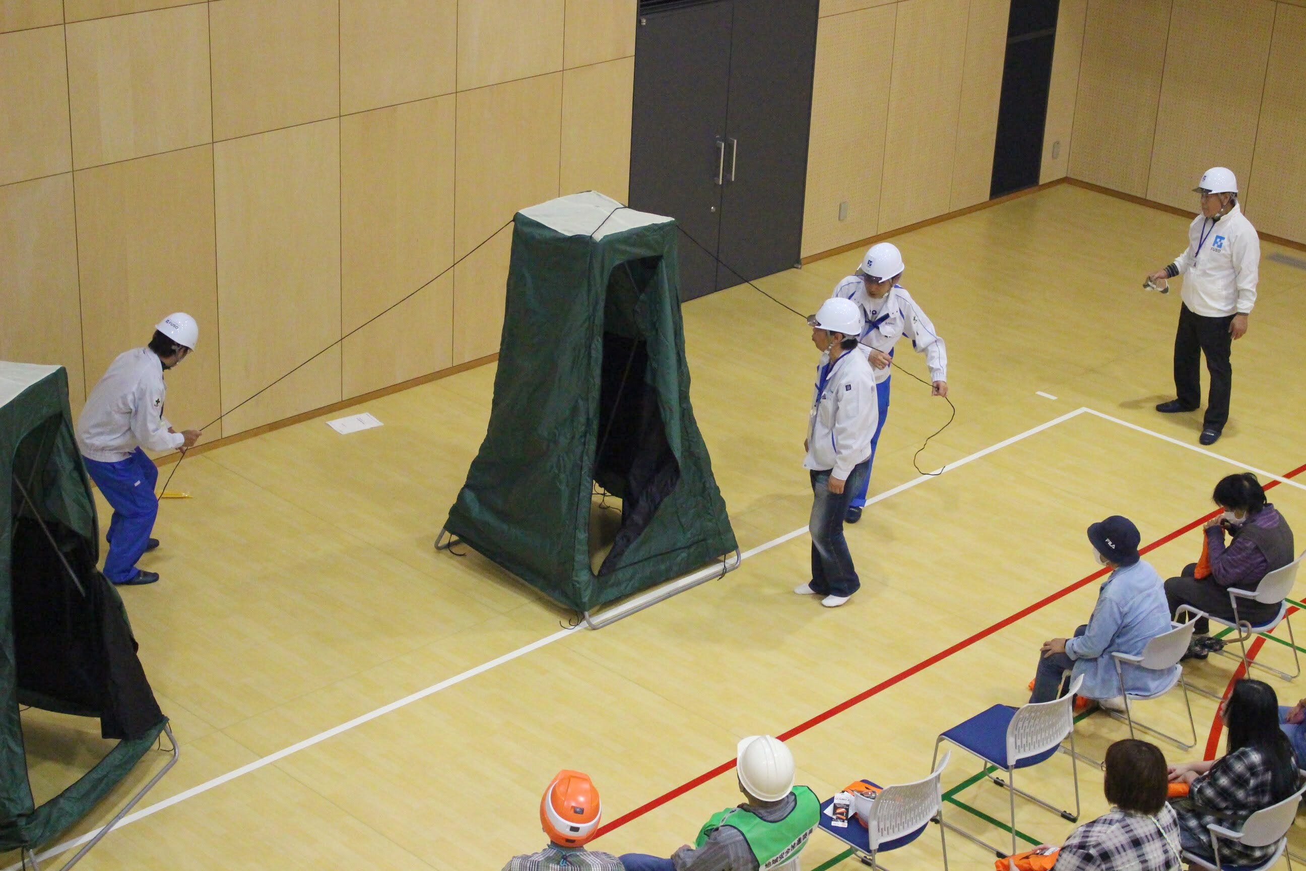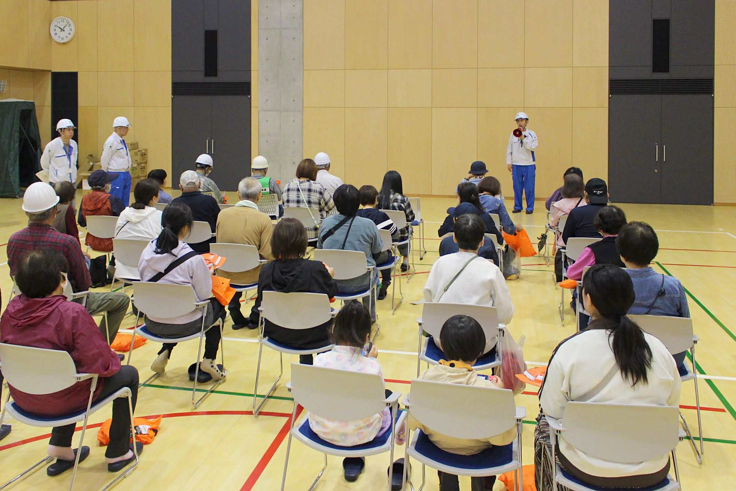 体育館にてフソウテクノセンター内の防災設備を説明