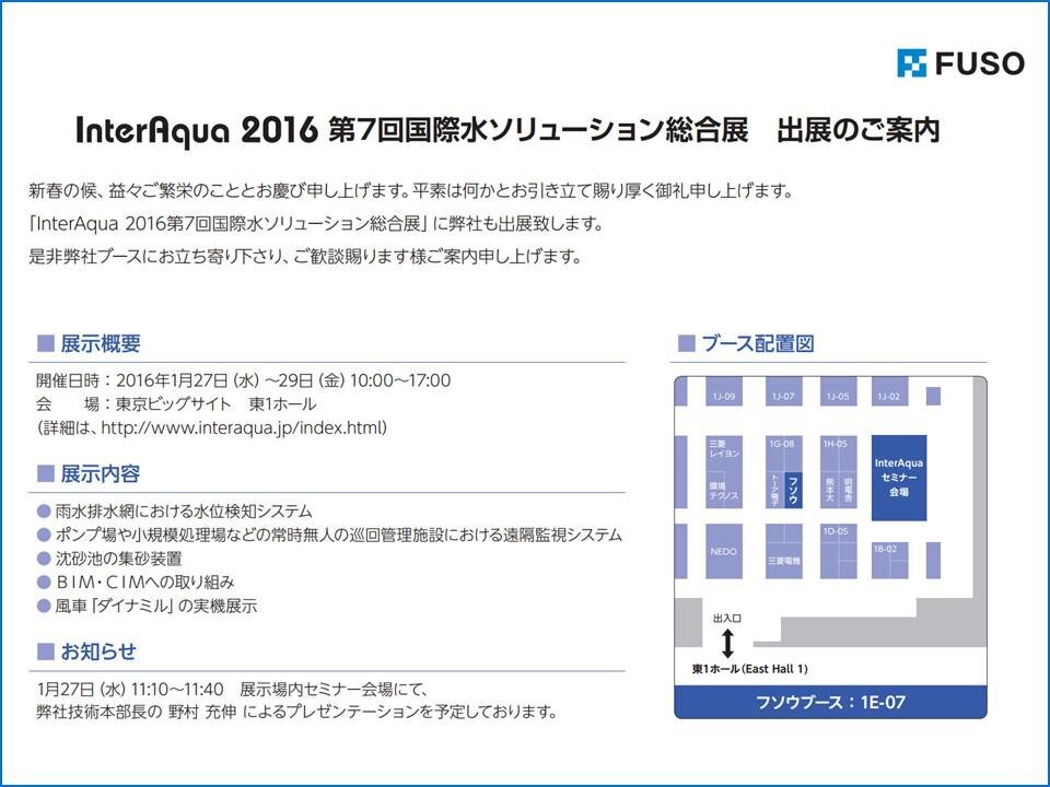2016年1月27日(水)〜1月29日(金)に開催される、「InterAqua2016 第7回国際水ソリューション総合展 」に出展致します。 ご来場の際は皆さまお誘い合わせの上、株式会社フソウのブースへお立ち寄り下さいますようご案内申し上げます。