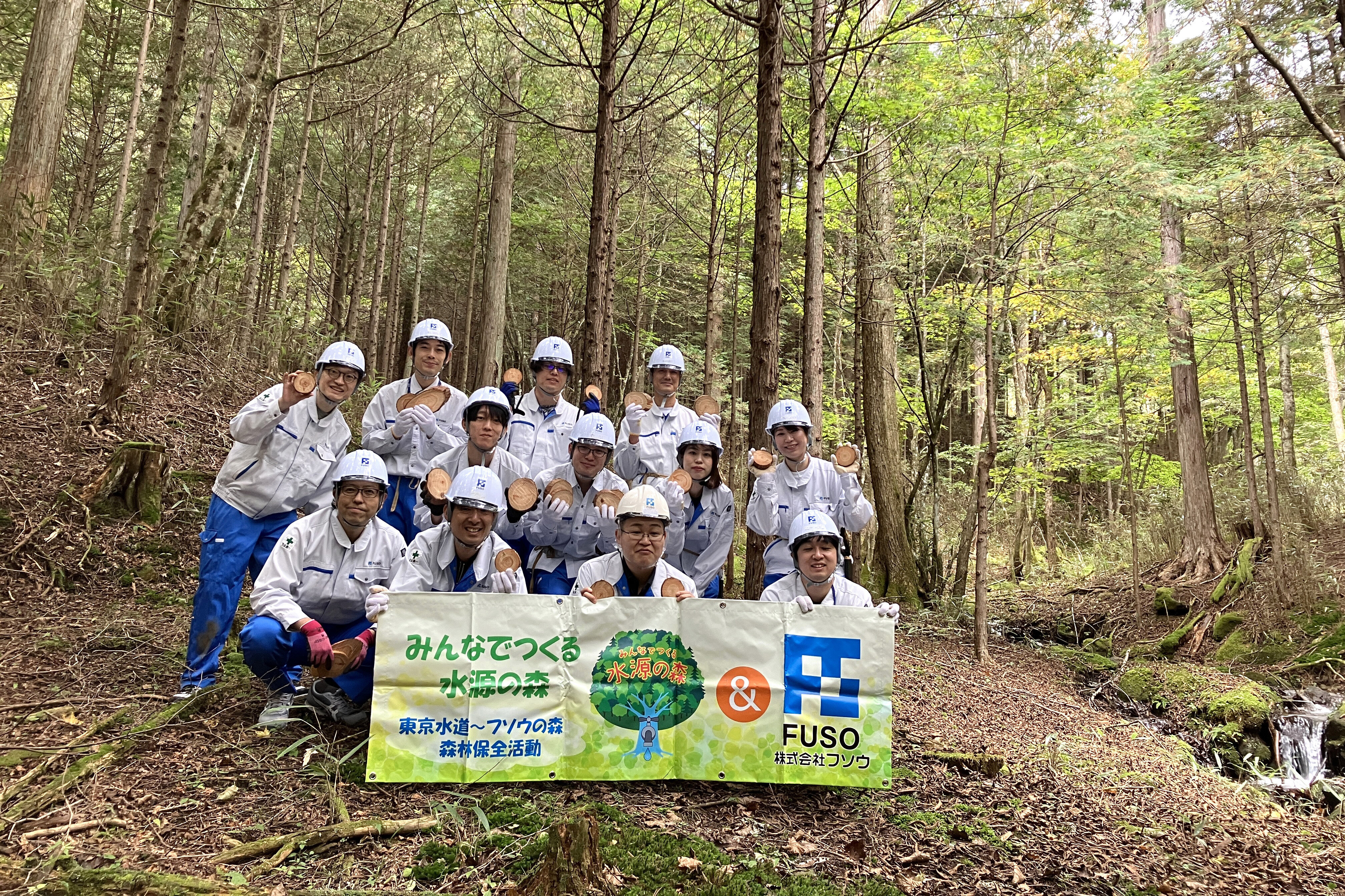 2024年10月16日(水)、爽やかな秋晴れのもと、山梨県甲州市の「フソウの森」にて、FUSOグループの社員12人による間伐作業を実施しました。株式会社フソウは、東京都水道局と締結した「東京水道~企業の森(ネーミングライツ)」協定に基づき、多摩川上流域エリアの水道水源林で森づくりを行っており、「フソウの森」と名付けたエリアで植栽や間伐を実施しています。